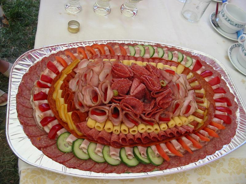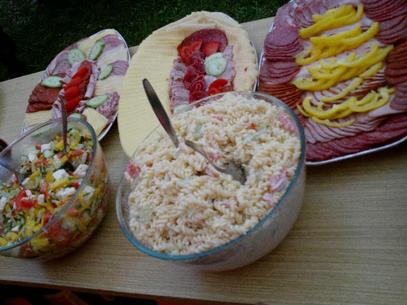 Hlavní jídlo: b) fazole s rajčatovou omáčkou, uzenina, chléb, okurek