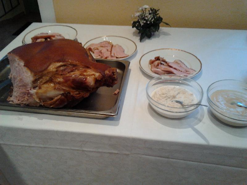 Hlavní jídlo: a) vepřová kýta na smetaně, knedlík, omáčka